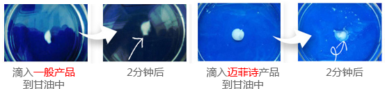 把两种产品滴入甘油里,2分钟后观察欧萃泊娅产品和普通产品的扩散程度,扩散能力好的更为温和。普通产品两分钟后依然浮在甘油上面,不能与甘油混合,而欧萃泊娅产品已经分散在甘油的各处, 能很快地与甘油互溶在一起。证明与皮肤的构成十分相近,有效缓冲过敏源对皮肤的刺激,达到抗过敏的功效,特别适合敏感的痘痘肌肤,不会造成刺激。